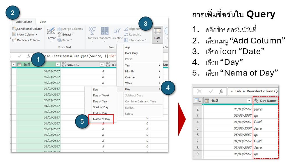 หลังจากกำหนดวันที่ได้ถูกต้อง เราจะสามารถใช้ฟังก์ชันเกี่ยวกับวันที่ได้ออย่างถูกต้องเช่นกัน เช่น ตัวอย่างที่ผมเพิ่มชื่อของวันในข้อมูล เป็นต้น